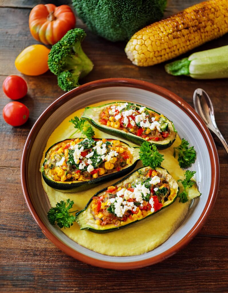 Saisonales Gemüse steht jetzt im Rampenlicht! Gefüllte Zucchini, cremiges Brokkoli-Tomaten-Püree und gerösteter Mais – ein…